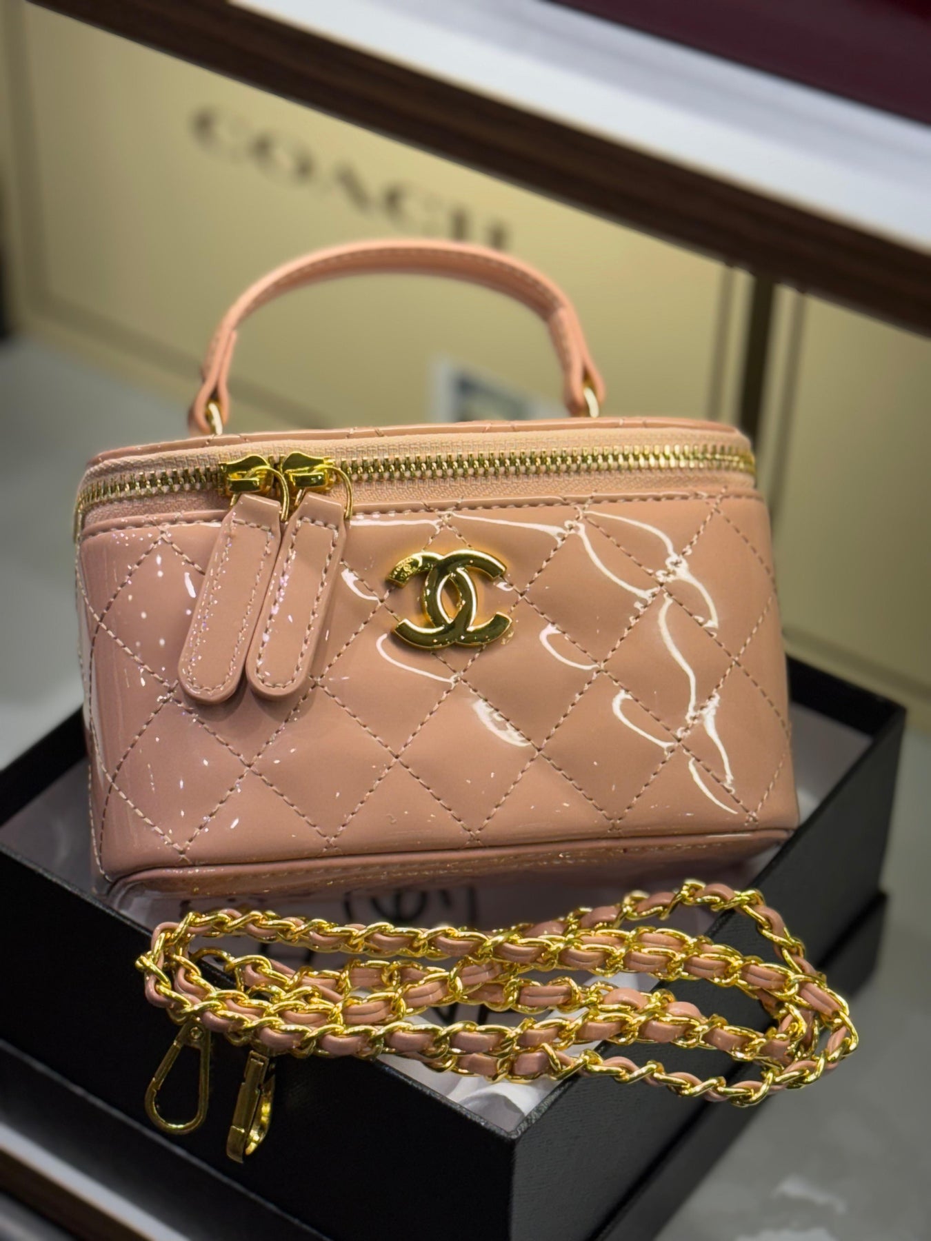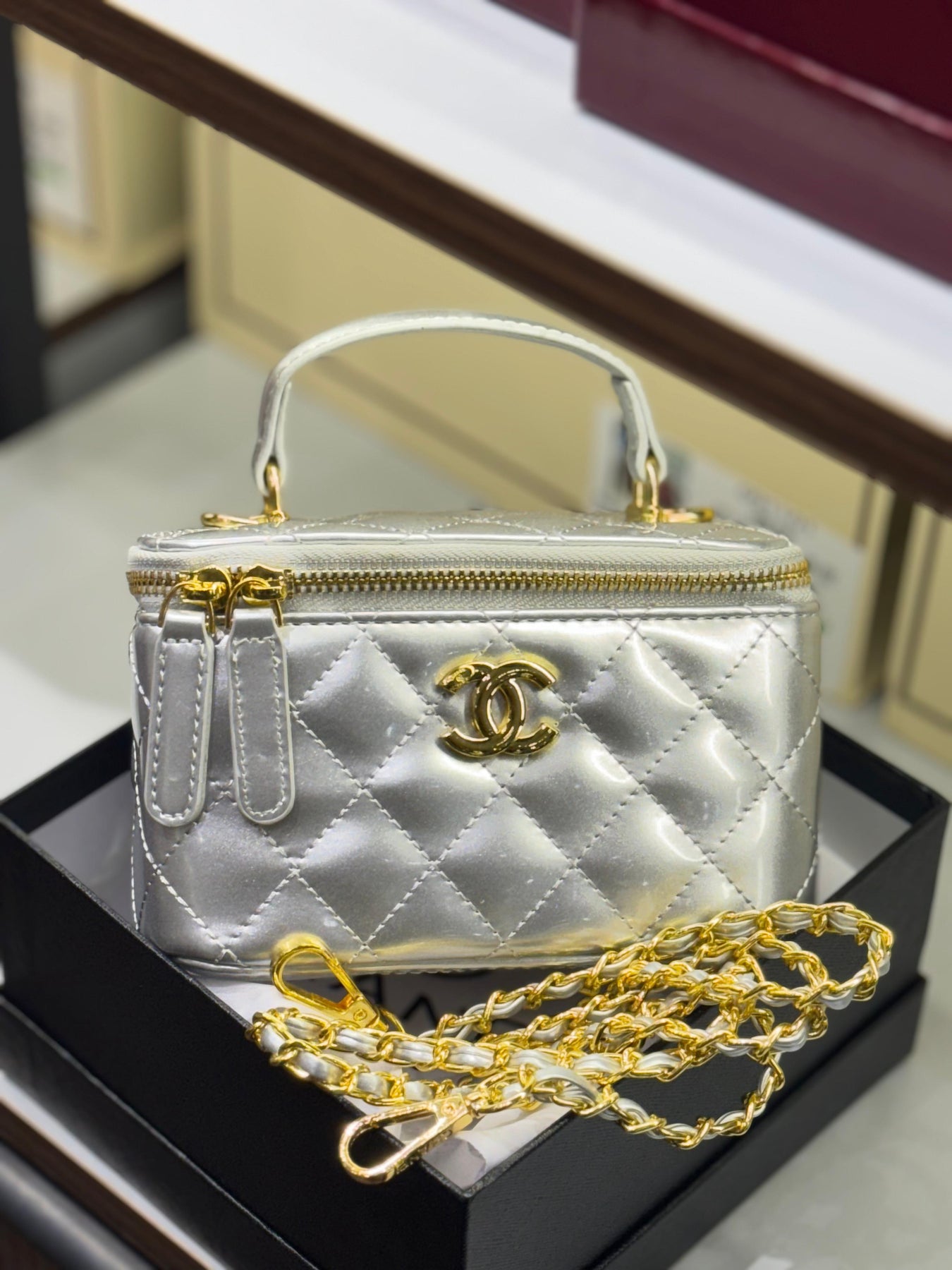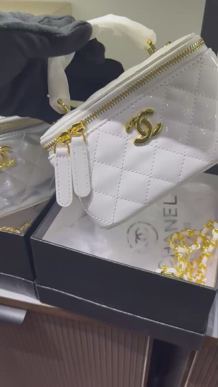 Chanel produces this bag in various sizes, a common size for a small version is approximately 16 cm (length) x 10 cm (height) x 8 cm (width). Design: The bag features a rectangular, boxy shape with a top handle and a chain strap. It is often made with quilted leather, such as patent leather or caviar leather, and has a prominent CC logo on the front. Hardware: The hardware, including the zippers and chain strap, is typically gold-toned. With Brand Box and Brand Dust Bag