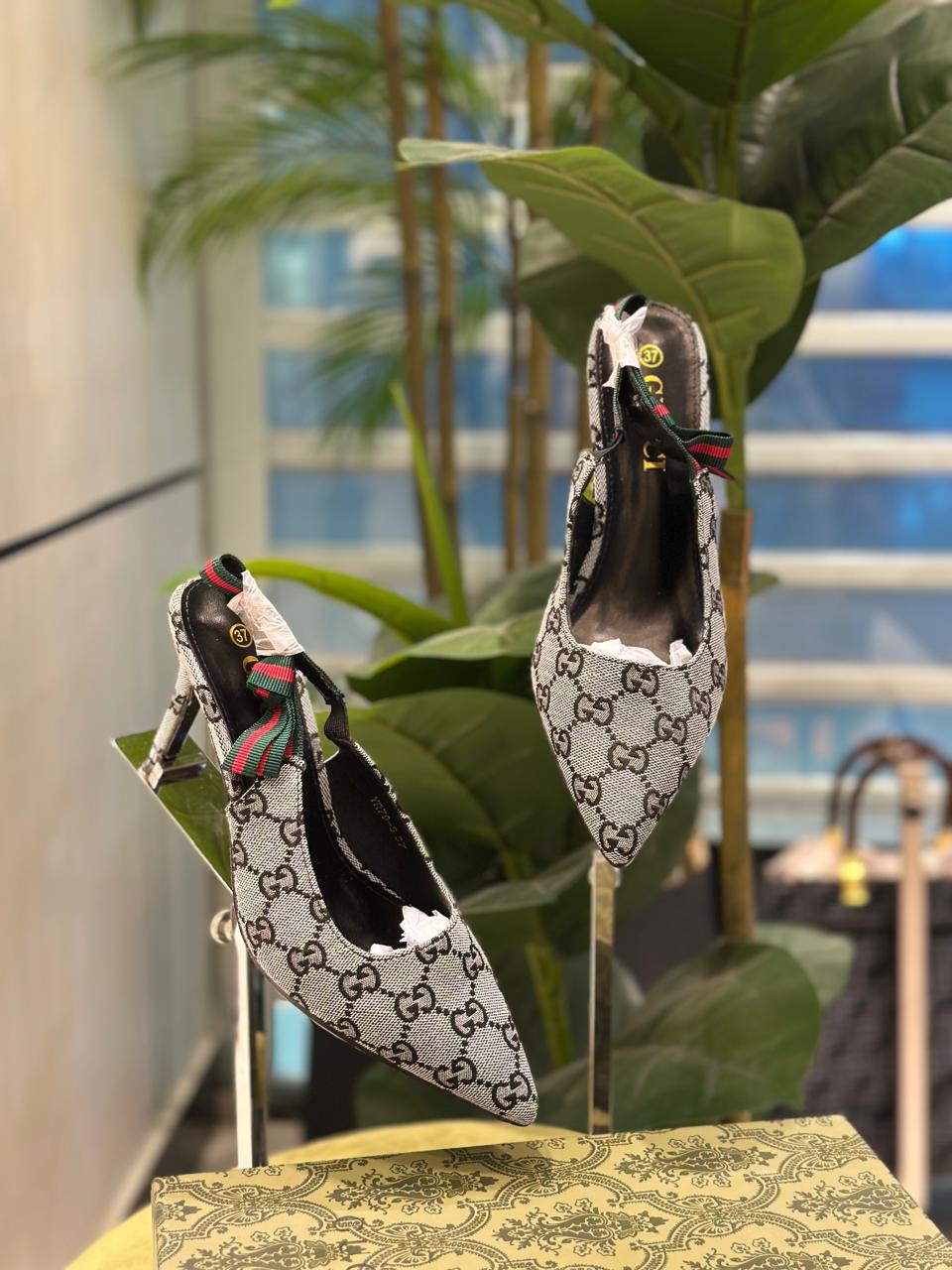 Dress up your feet with Famous brand Gu-cci heel for women. These high-quality heels from a renowned brand will elevate any outfit. Show off your style and sophistication with these stunning heels, perfect for any occasion. Made with the finest materials, these heels will provide you with both comfort and fashion-forward style.